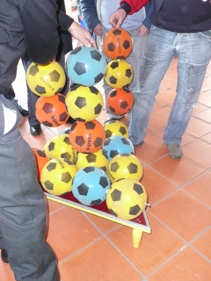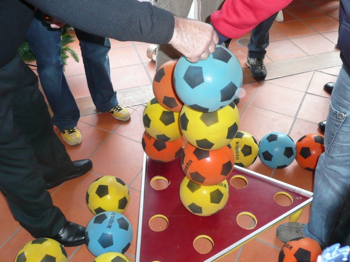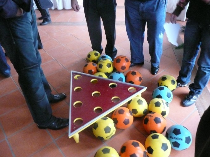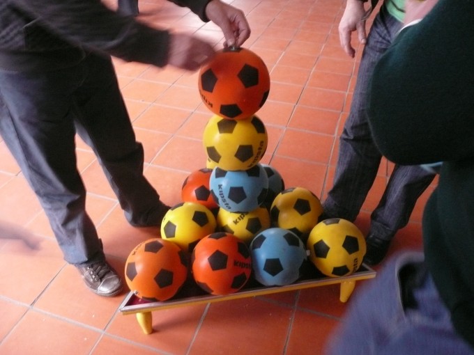 O Jogo da Pirâmide é composto por uma estrutura em madeira (de forma triangular) e seis conjuntos de bolas ancoradas (dois conjuntos de quatro bolas e quatro conjuntos de três bolas).