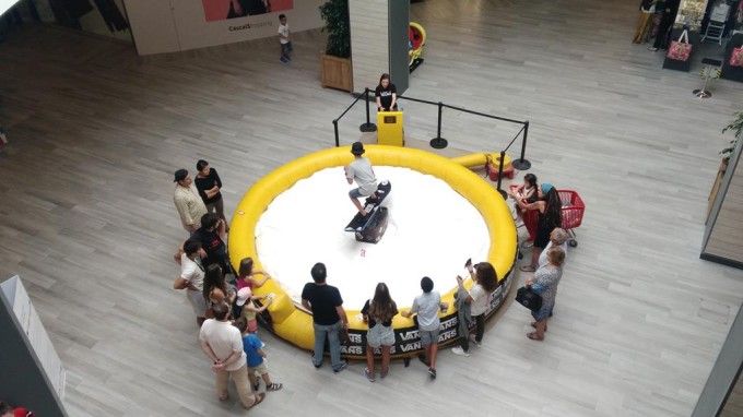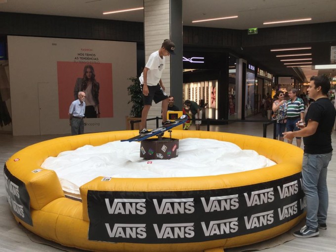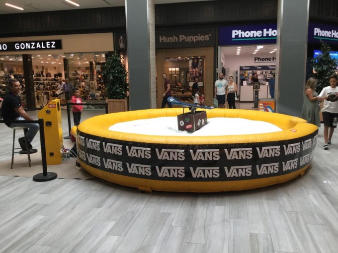 A inevitável queda do participante é amortecida pela estrutura insuflável que rodeia o equipamento.