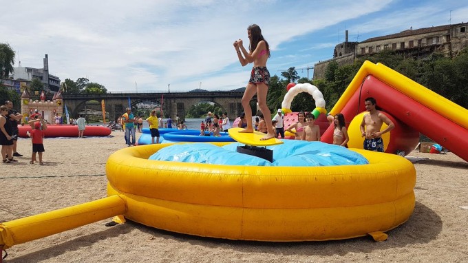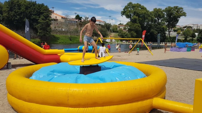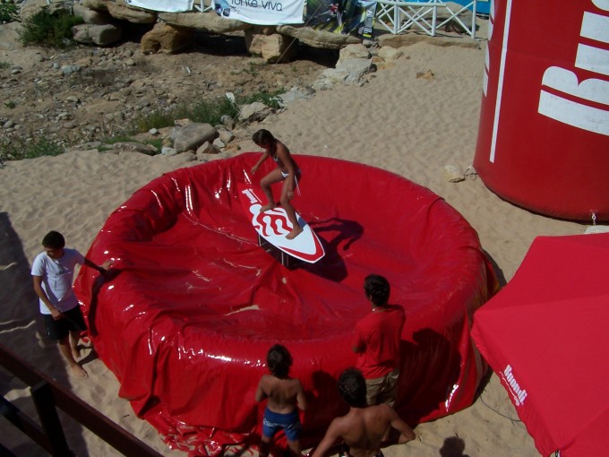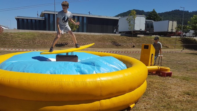 Este equipamento é composto por uma prancha de surf onde os participantes procuram, surfando, manter-se em pé sobre a prancha em movimento, simulando as ondas.