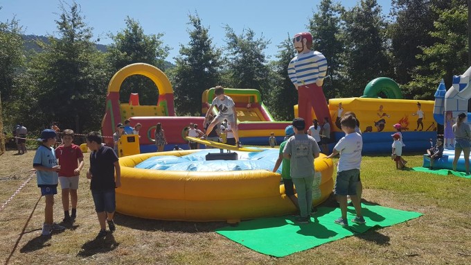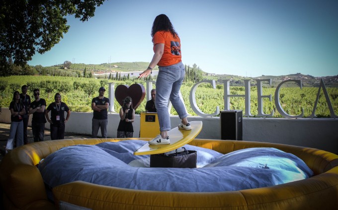 A inevitável queda do participante é amortecida pela estrutura insuflável que rodeia o equipamento.